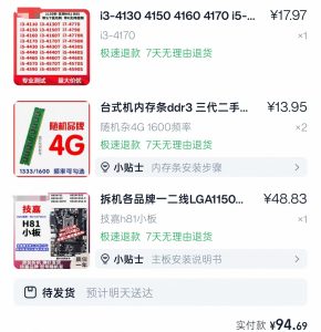 谁懂啊家人们!刚花 94 块 6 毛 9,把一台能开机的电脑 “拼” 出来了 —— 现在快递还在路上,我已经开始脑补它开机冒火花的样子了🤣